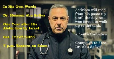 We mark one year of detention and physical and mental torture of Dr. Hussam Abu Safiya. Activists will do readings from his posts and then we'll discussion on how to act to free him and all the health workers.